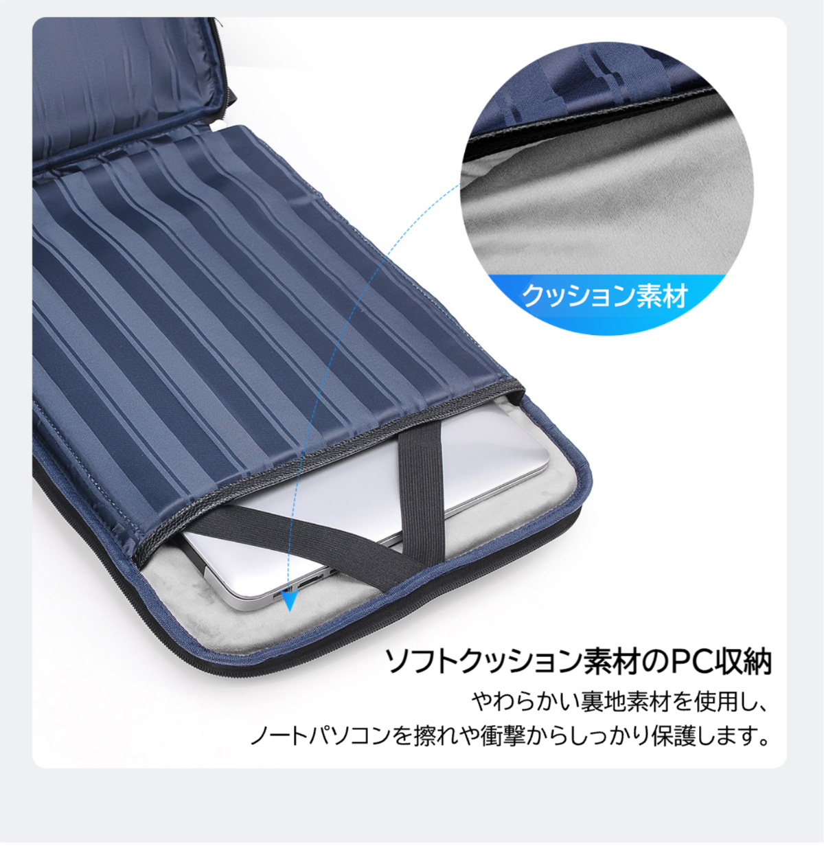 15.6インチのノートパソコンを収納できる専用ポケットを備え、クッション素材でしっかり保護します。