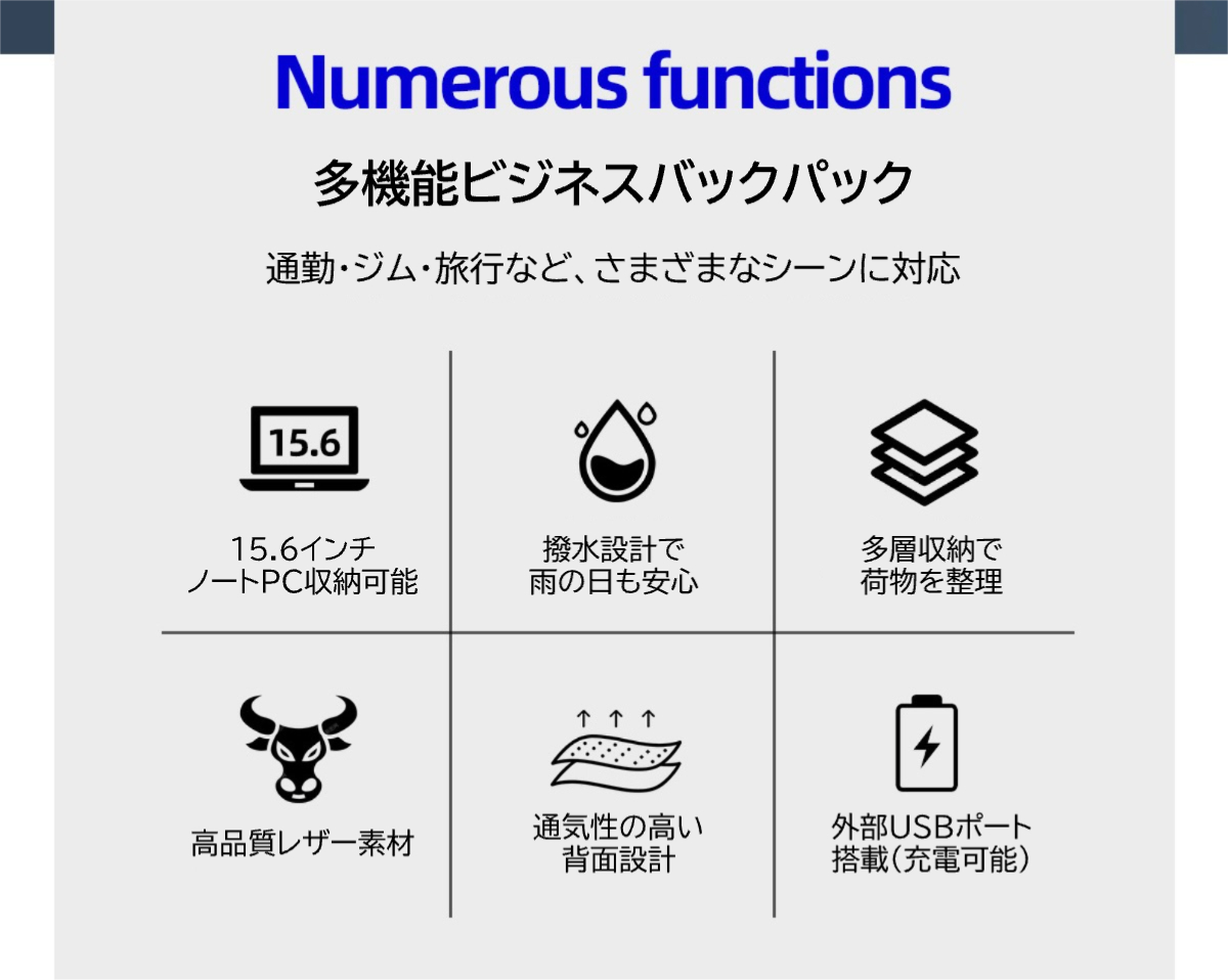 大容量ビジネスリュック USBポート付き 15.6インチPC対応 撥水 通気設計 多収納 バックパック 通勤 出張 旅行用【1284634】