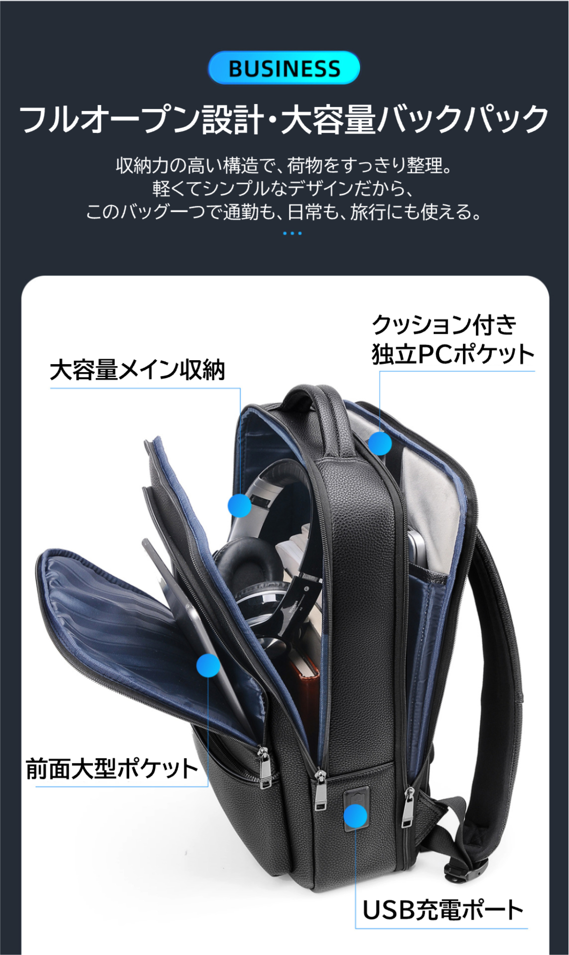 通勤・出張・旅行まで幅広く使える、機能性に優れたビジネスバックパック。