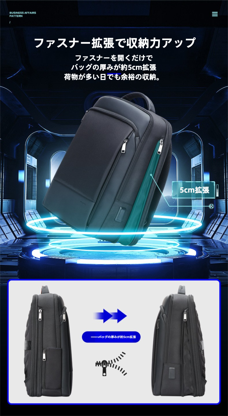 さらに、拡張ファスナーを開くことでバッグの厚みが約5cm広がり、収納容量がアップ。荷物が多い日や出張時にも便利です。