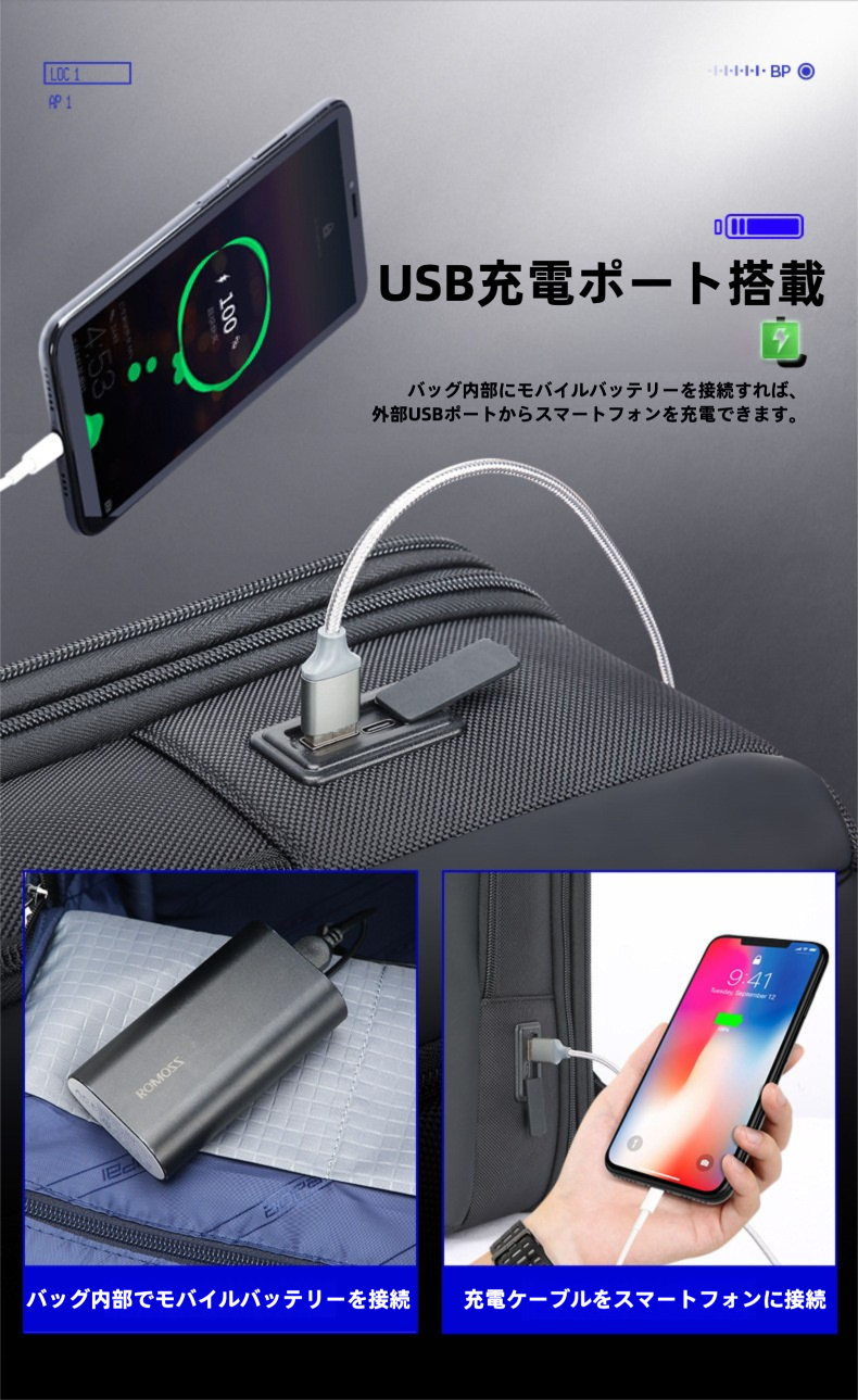 バッグ内部にモバイルバッテリーを接続すれば、外部ポートからスマートフォンを充電可能。移動中でも快適に充電できます。