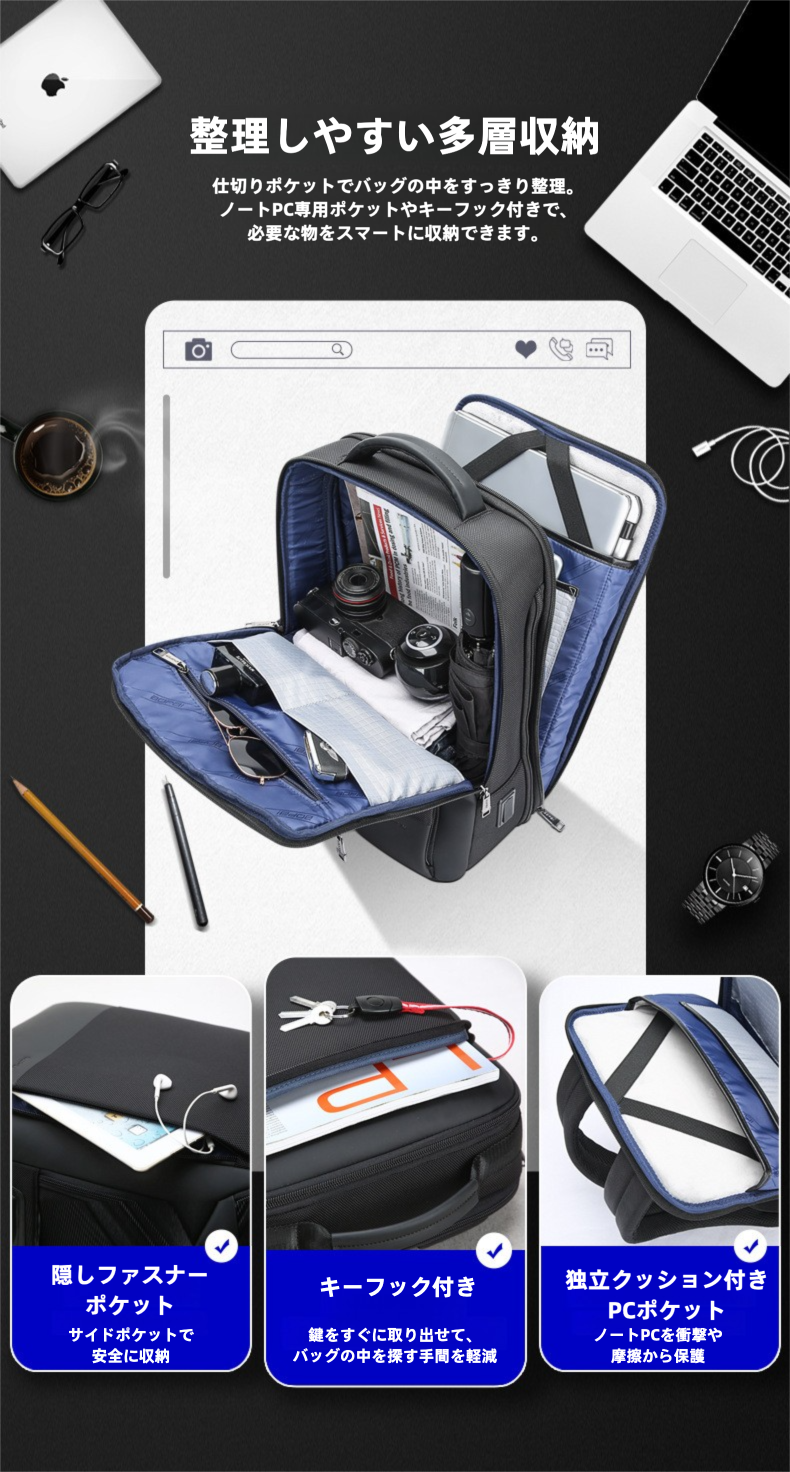 収納力・機能性・デザインを兼ね備えた多機能ビジネスリュック。