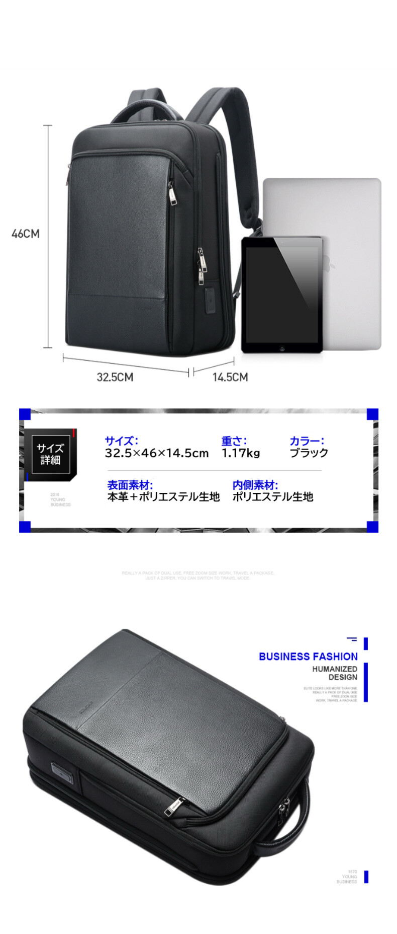 ビジネスリュック メンズ 本革調 大容量 PC収納 15.6インチ対応 通勤 出張 防水 多機能 バックパック ビジネスバッグ ブラック 【1284638】
