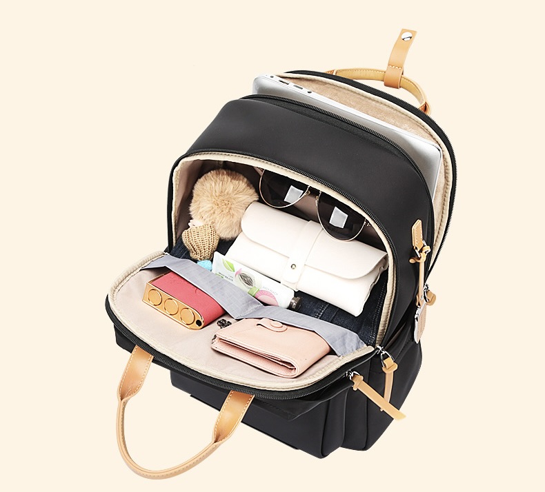 内部は整理しやすい設計になっており、14インチのノートパソコンをはじめ、財布やポーチ、折りたたみ傘など日常の持ち物をすっきり収納できます。必要な物を取り出しやすく、バッグの中が散らかりにくい構造です。