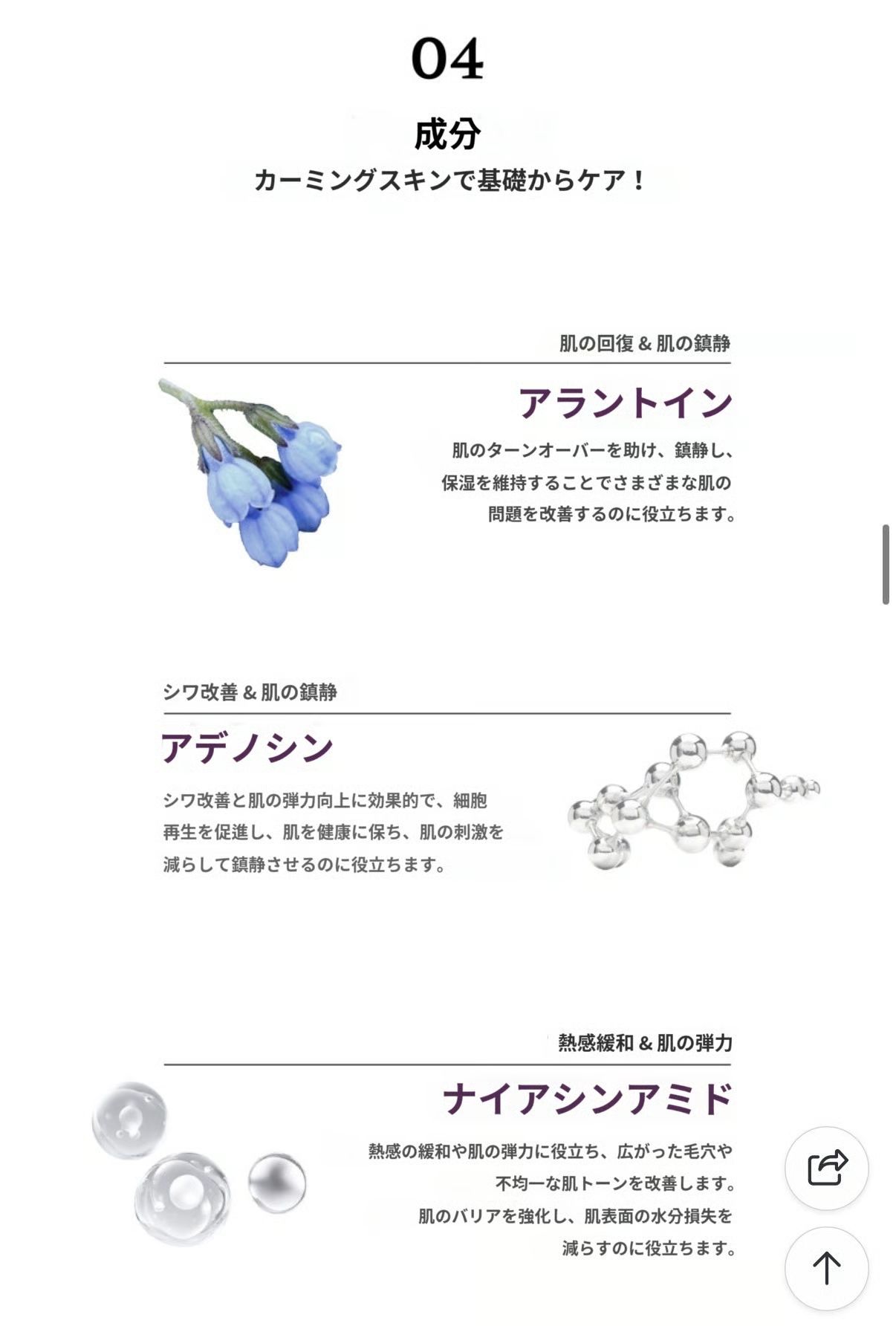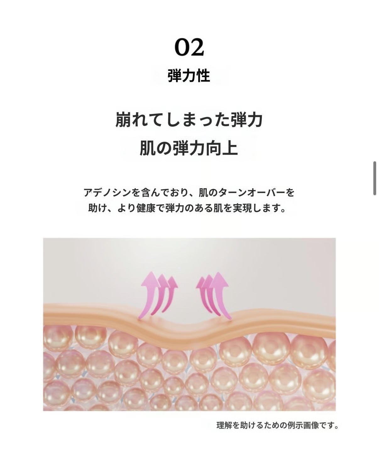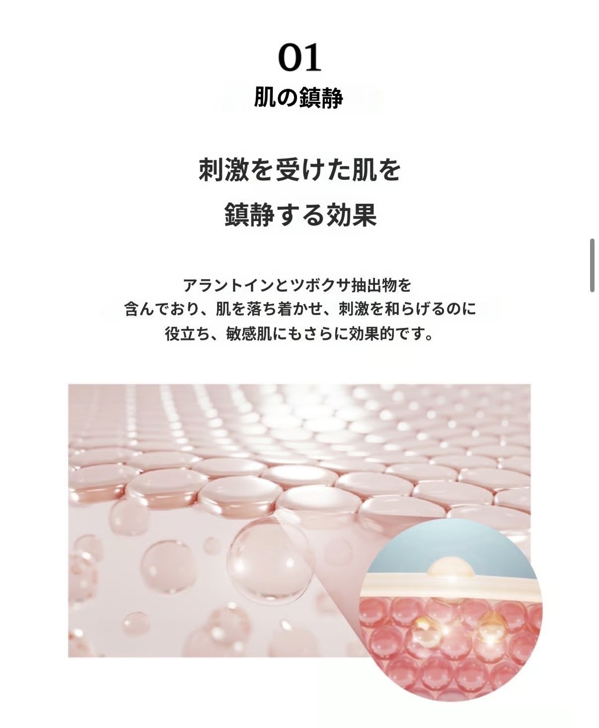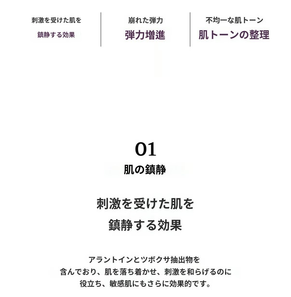 アラントイン・ツボクサ抽出物を中心に、肌を落ち着かせながら、弾力・肌トーン・バリア機能をサポートします。韓国食品医薬品安全処認証の二重機能性化粧品として、肌の明るさケアとハリケアを同時に叶える設計です。