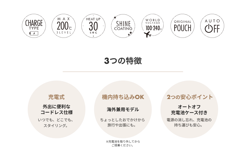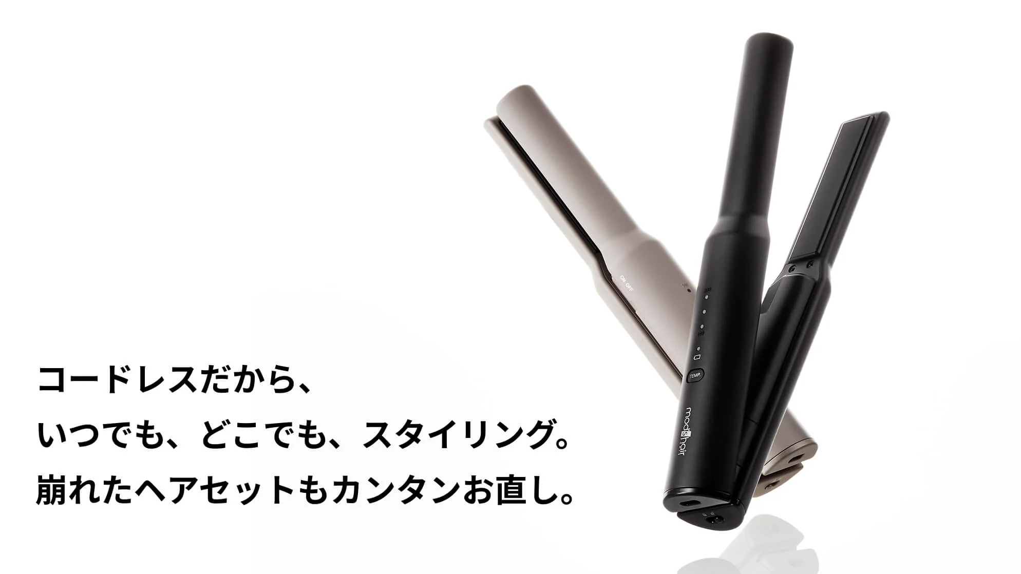 コードレス仕様で場所を選ばず使える、持ち運びに便利なヘアアイロンです。