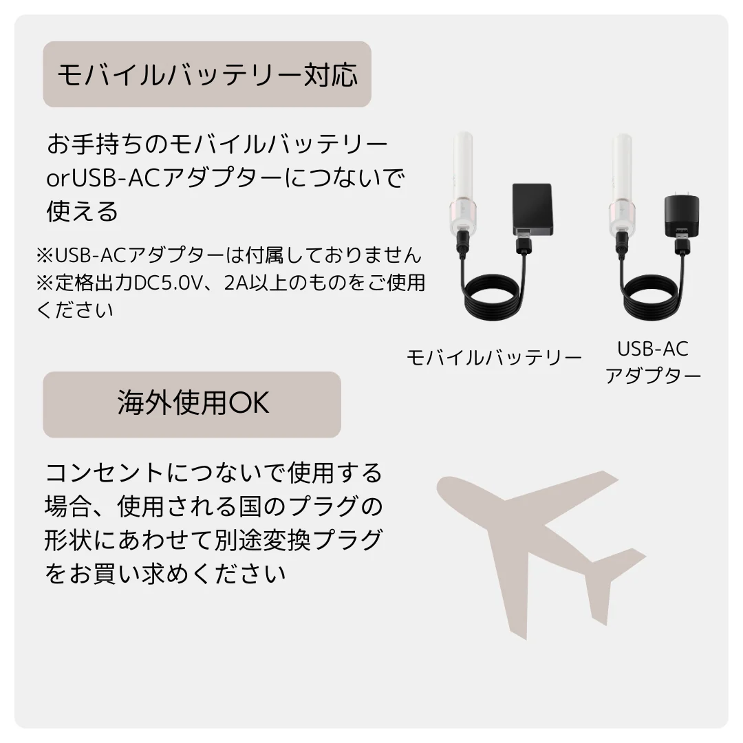 お手持ちのモバイルバッテリーと付属のマイクロUSBケーブルをつなげていつでもどこでもヘアセット。