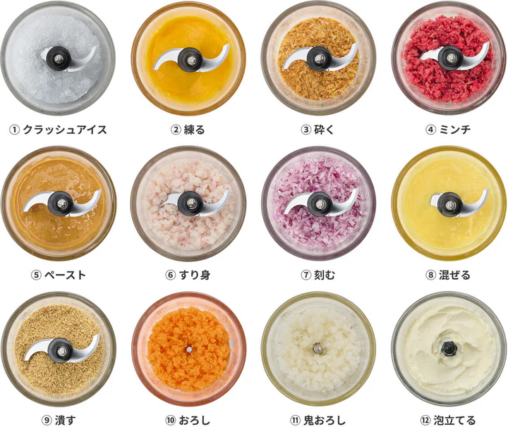 - 2段階スピード切替:高速=しっかり調理/低速=やわらかい食材を好みの粗さに