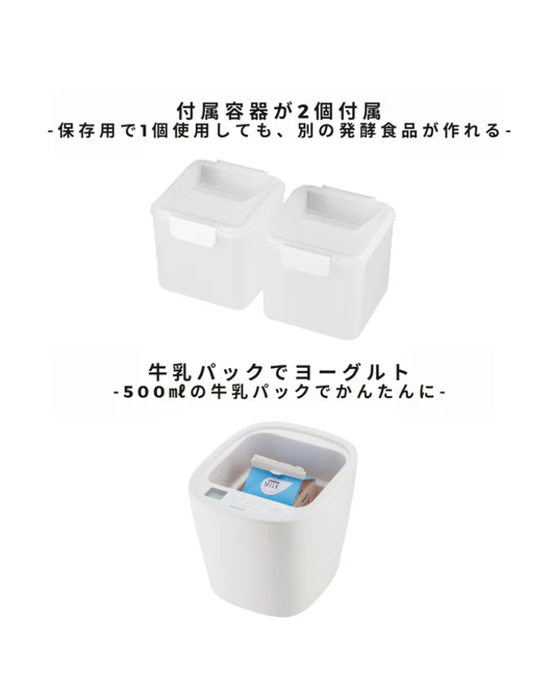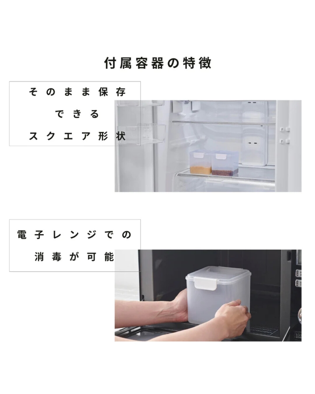 | 付属品 | 容器×2個、スプーン×1個、牛乳パック用クリップ×1個、カラーレシピブック×1 |